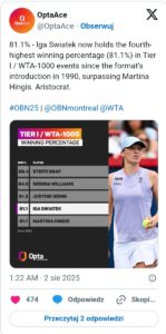 Nie jest to jednak najważniejsza statystyka, jaką po tym meczu podała Opta. Ta najcenniejsza dotyczy odsetka wygranych w turniejach WTA 1000. Format ten powstał w 2009 roku i często Świątek przy prześwietlaniu liczb z tych zawodów konkuruje wyłącznie z dokonaniami Sereny Williams. Tym razem rozszerzono poszukiwania do 1990 roku. Od wtedy do 2008 r. istniały turnieje WTA Tier I, odpowiednik “tysięczników”.