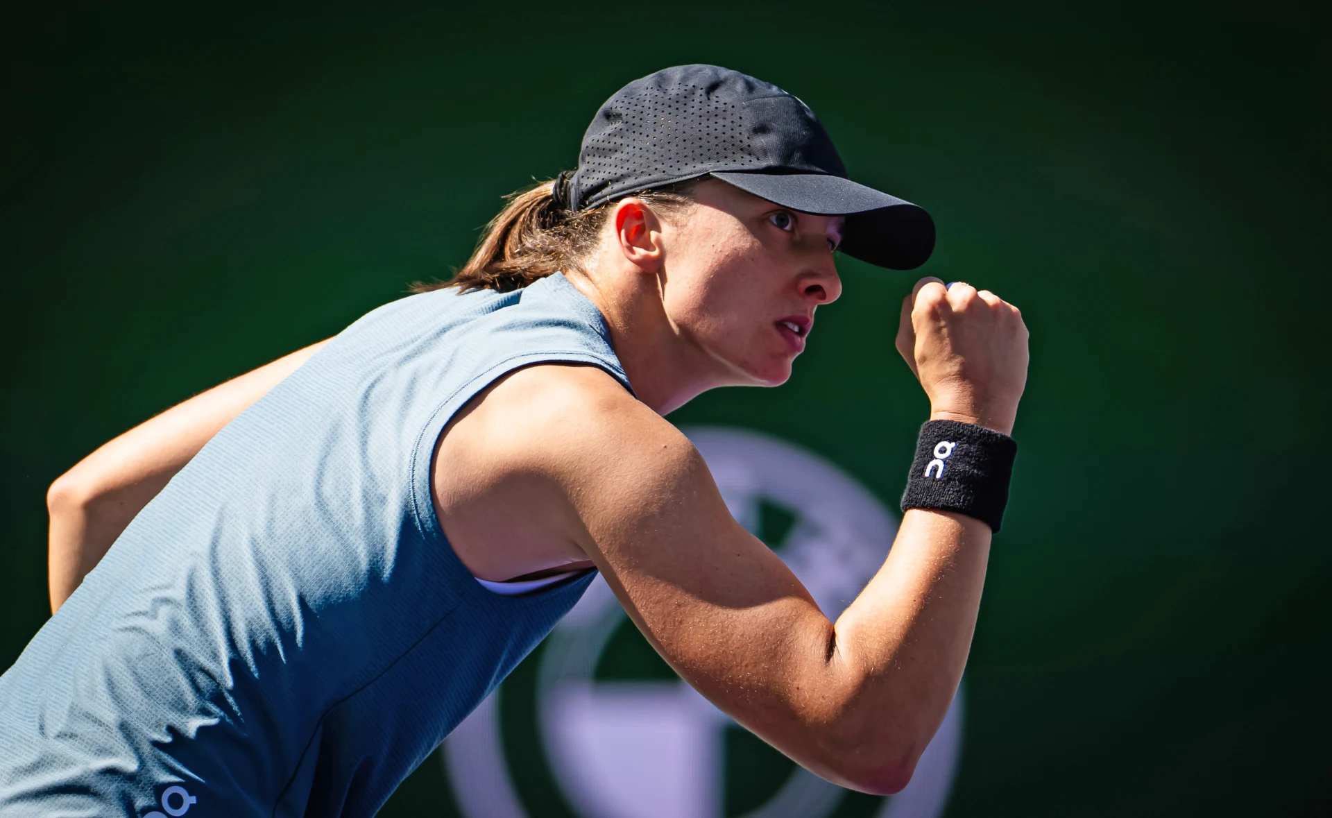 Tenisistka w sportowym stroju oraz czapce z daszkiem wykonuje gest ręką na ciemnym tle, skupiona na grze.