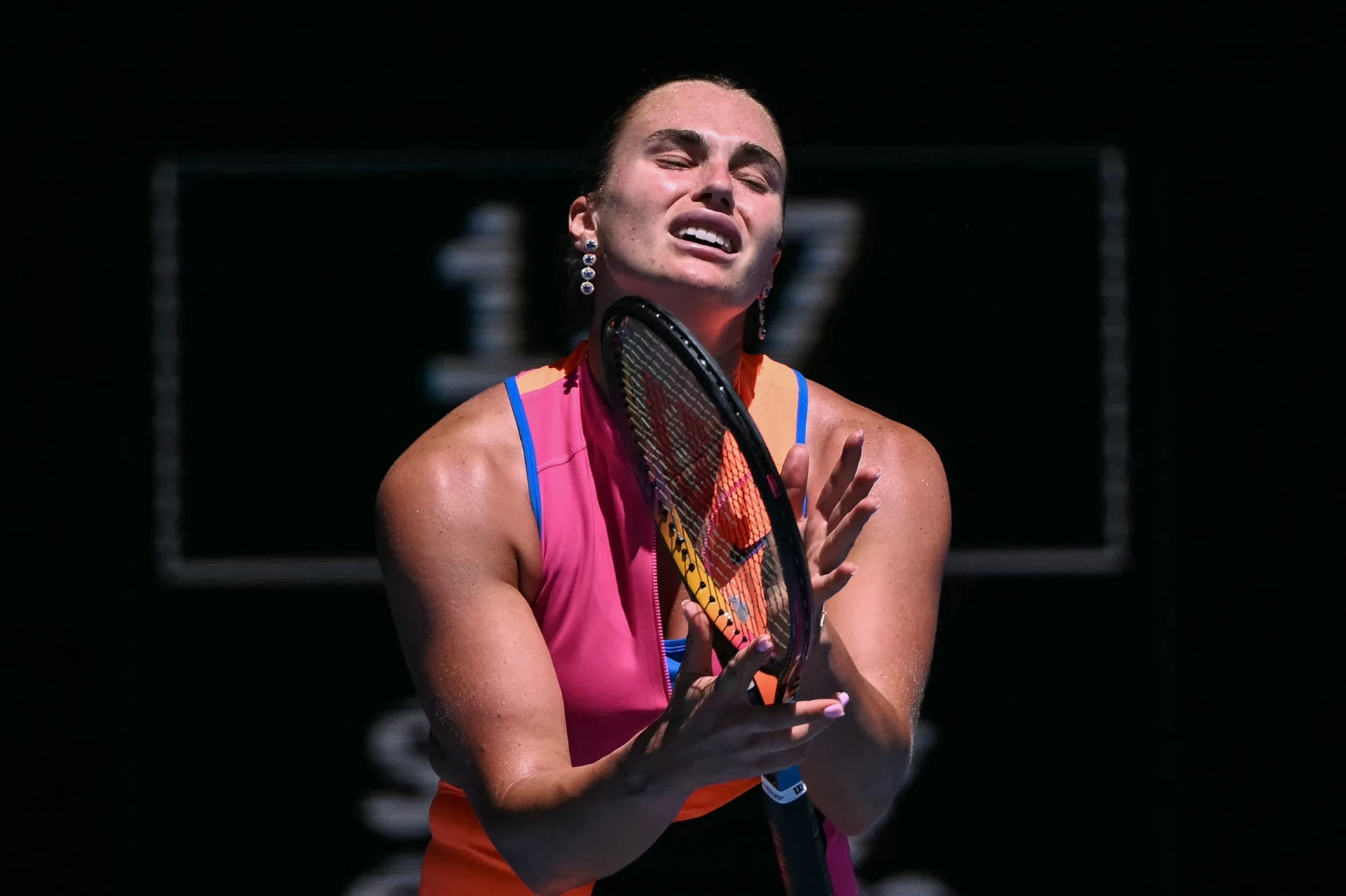Zawodniczka tenisowa w kolorowym stroju sportowym z rakietą w rękach, wyrażająca silne emocje z grymasem na twarzy podczas meczu, na ciemnym tle z rozmytą tablicą wyników w tle.