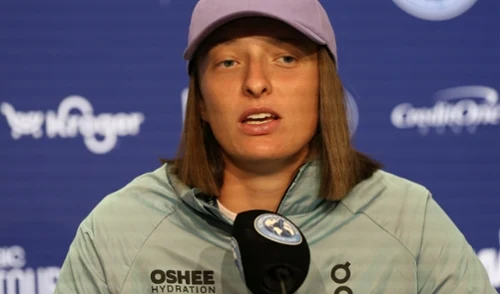 Iga Świątek w sportowej kurtce i fioletowej czapce udziela wywiadu przy mikrofonie na tle logo sponsorów.