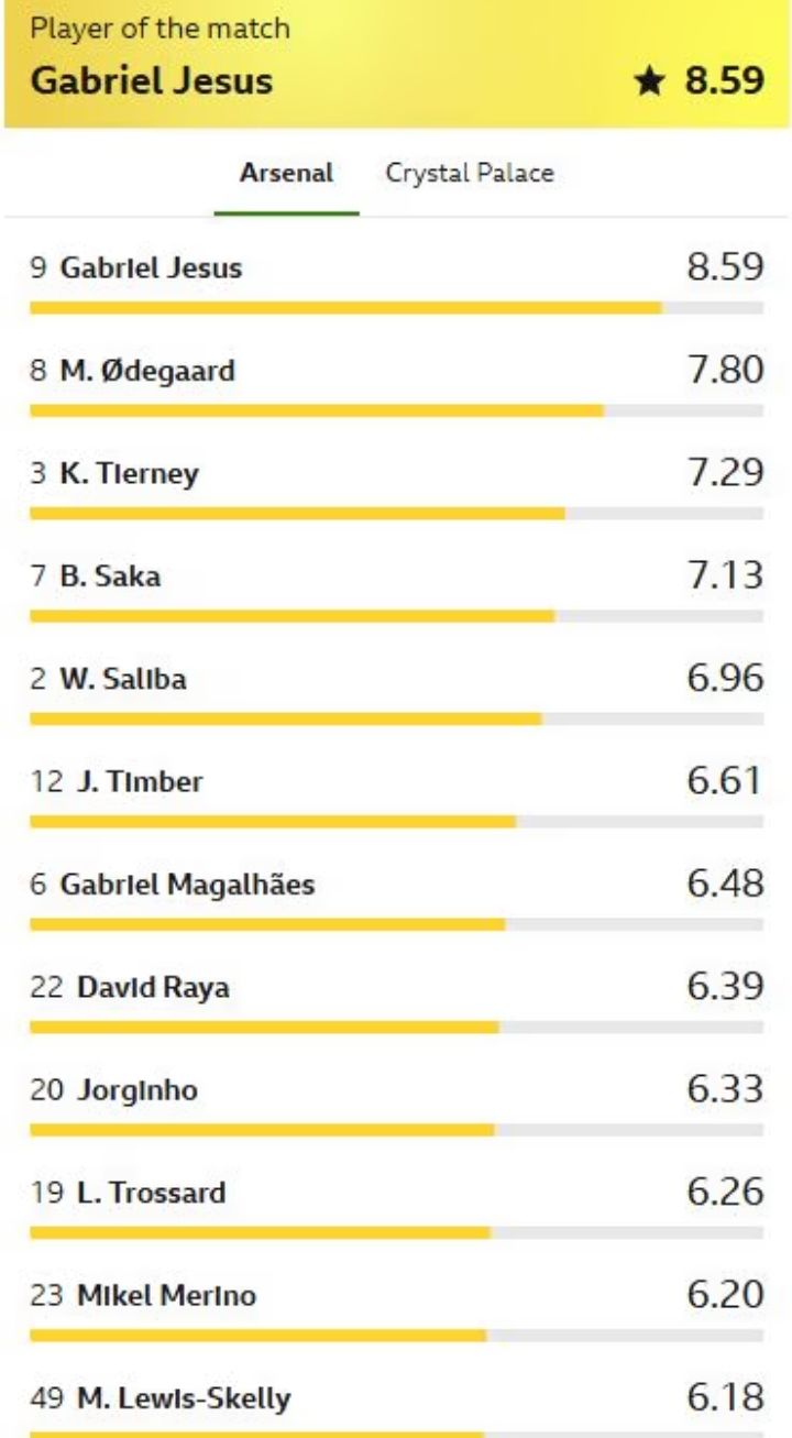 Polski defensor Już w czwartej minucie spotkania źle obliczył lot piłki, nie trafił w nią, a Jean-Philippe Mateta bez większych problemów wykorzystał ten błąd i pokonał Davida Rayę. Ta sytuacja mocno wpłynęła na oceny pomeczowe Kiwiora, który według największych angielskich mediów był jednym z najsłabszych lub najsłabszym graczem Arsenalu. W większości jego ocena oscyluje w granicach noty 5 na 10.