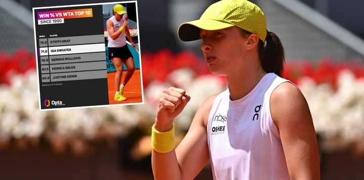 “71,0 — Iga Świątek wyprzedziła Serenę Williams (70,9%) pod względem wskaźnika wygranych spotkań przeciwko tenisistkom z pierwszej dziesiątki rankingu WTA. Ustępuje jedynie Steffi Graf (75%)” — podali statystycy z Opta Ace. W klasyfikacji pod uwagę brane są tenisistki, które rozegrały przynajmniej dziesięć spotkań z rywalką z czołowej dziesiątki.
