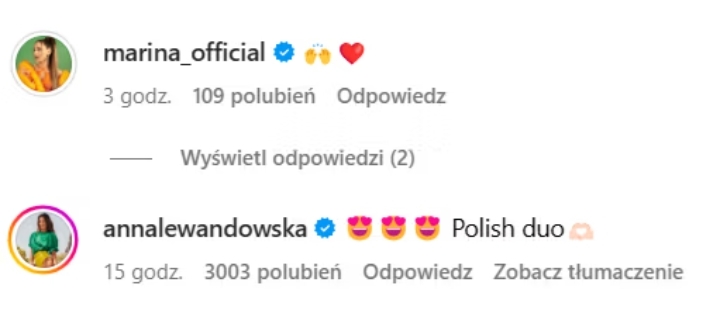 “Polski duet” — napisała w komentarzu Anna Lewandowska. Dodała też kilka emotikon, w tym uśmiechniętych twarzy z oczami w kształcie serc. Na wpis emotikonami zareagowała też Marina Łuczenko-Szczęsna.